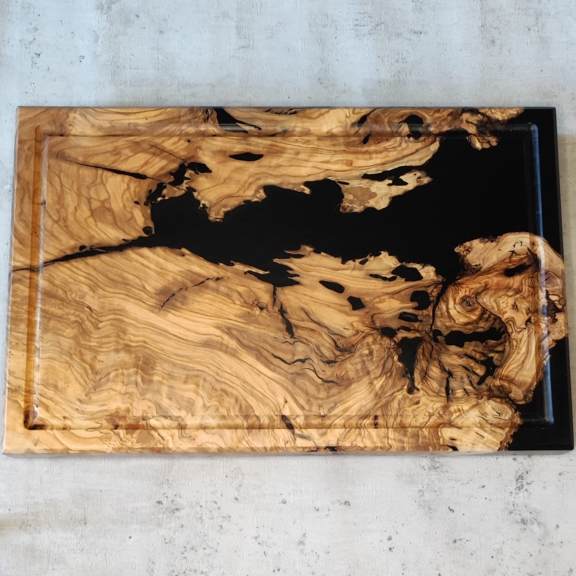 Dieses hochwertige Brett aus edlem Olivenholz und farbigem Epoxidharz vereint elegantes Design mit praktischer Funktionalität. Die integrierte Saftrille fängt Flüssigkeiten zuverlässig auf.