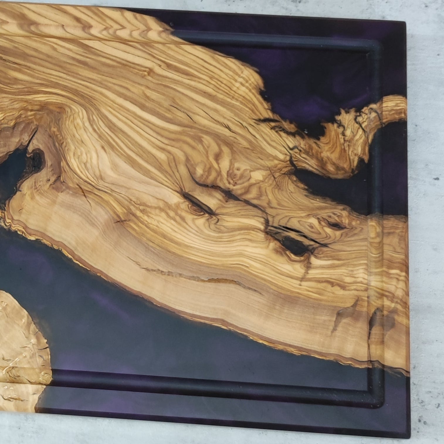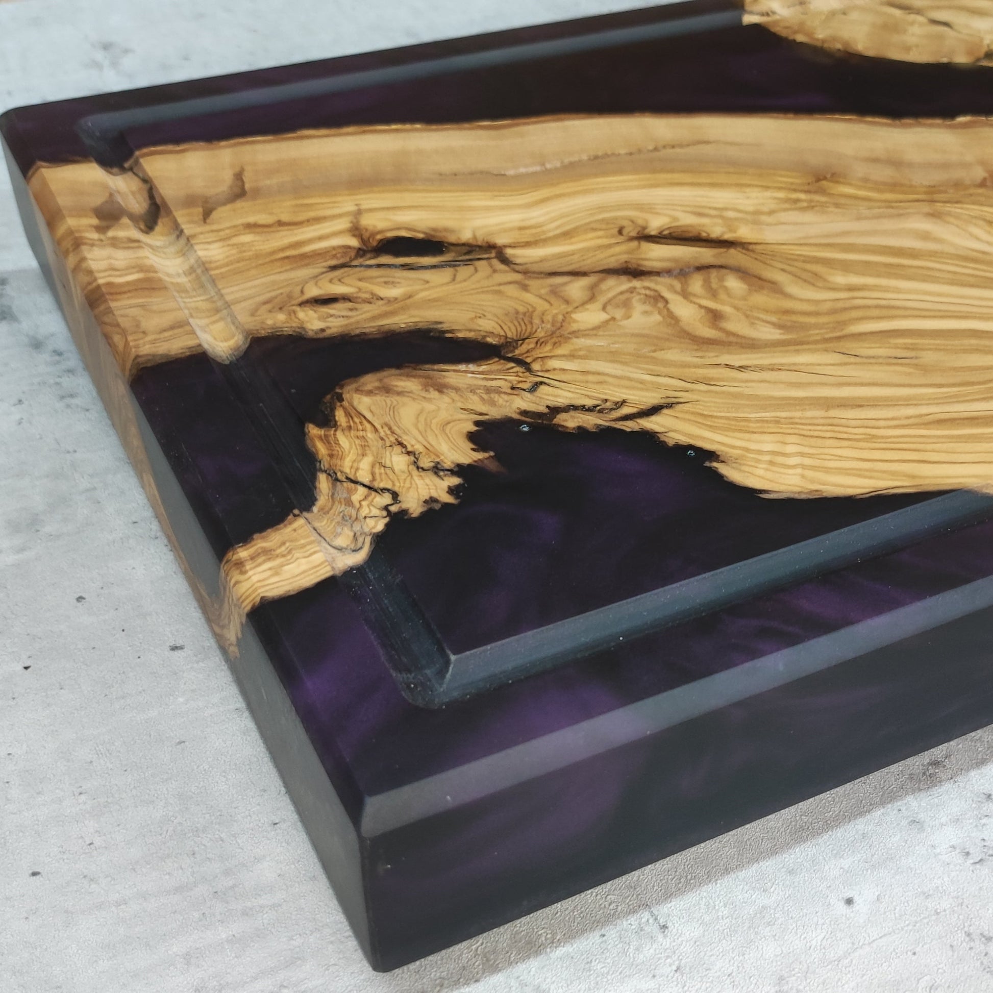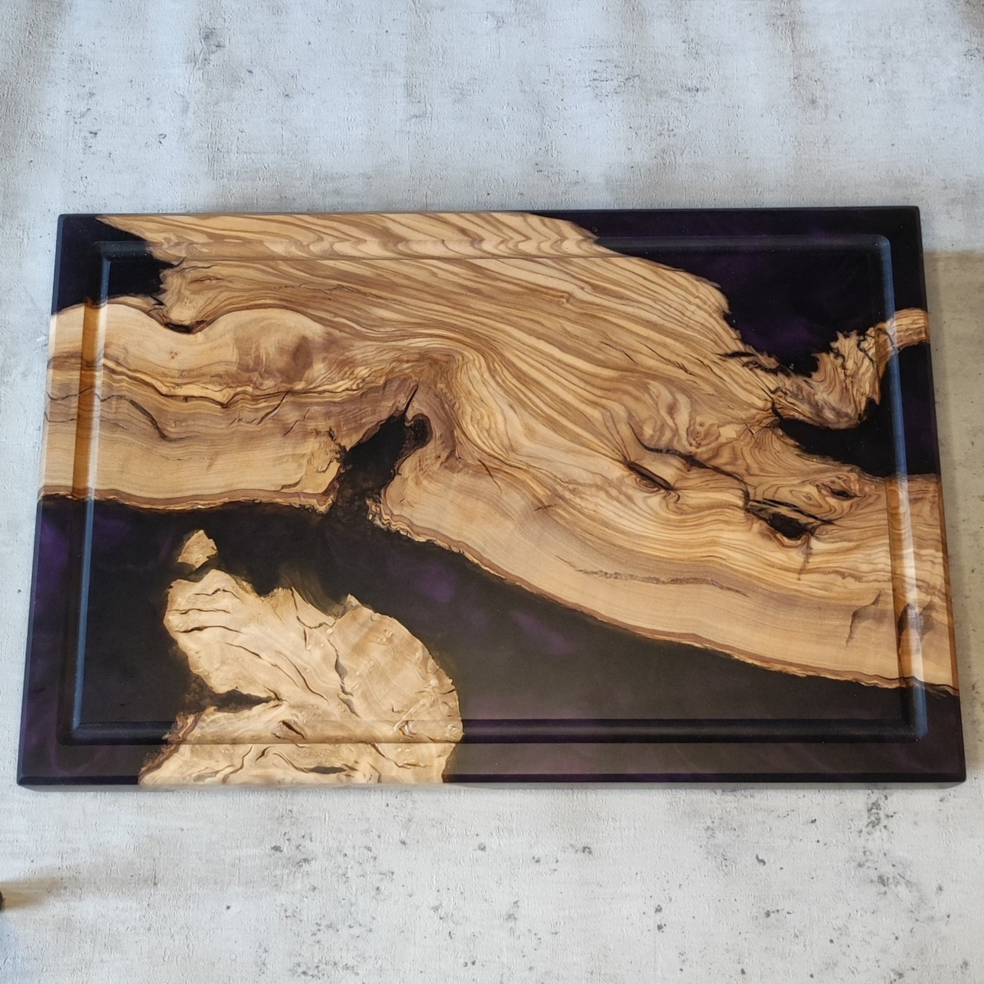 Dieses hochwertige Brett aus edlem Olivenholz und farbigem Epoxidharz vereint elegantes Design mit praktischer Funktionalität. Die integrierte Saftrille fängt Flüssigkeiten zuverlässig auf.