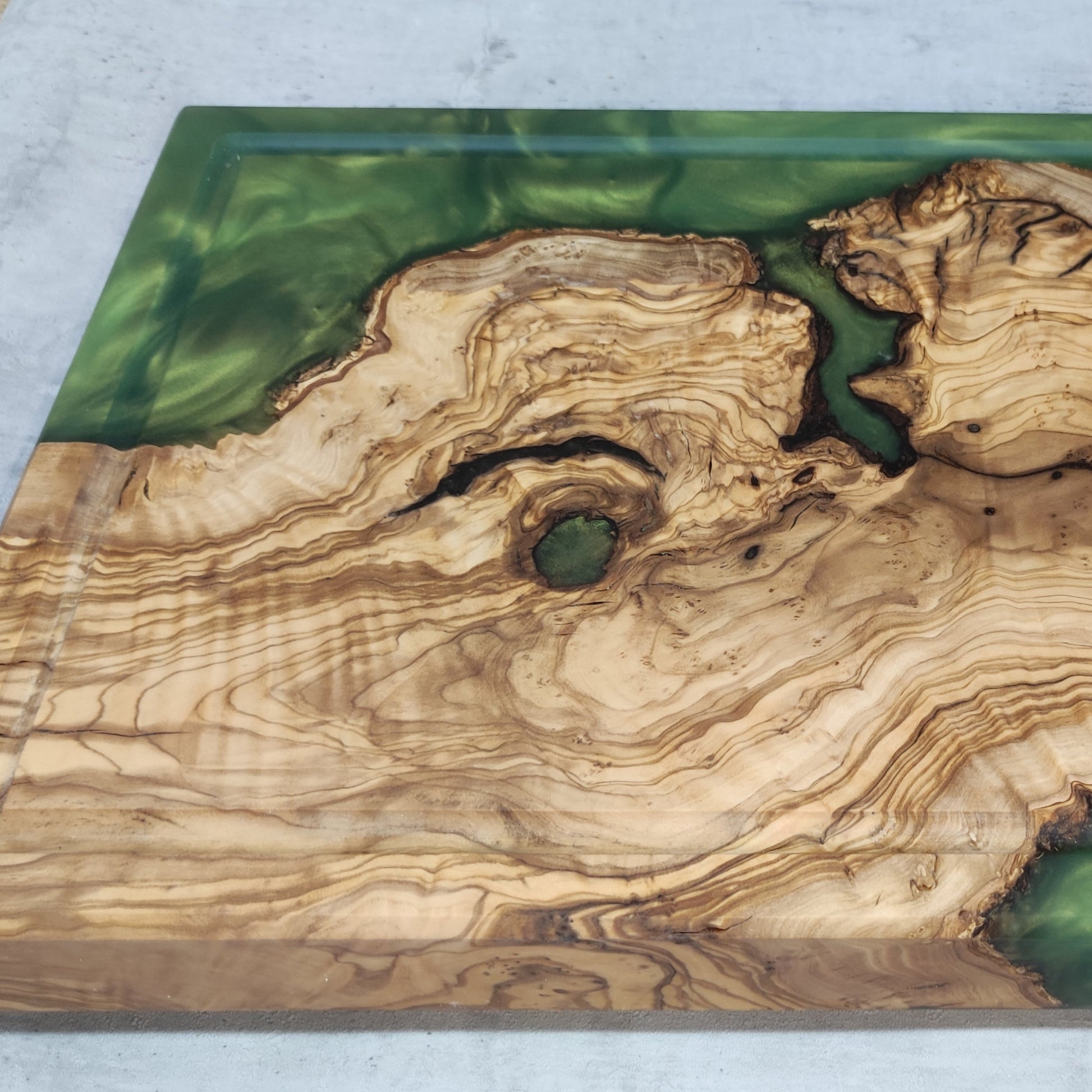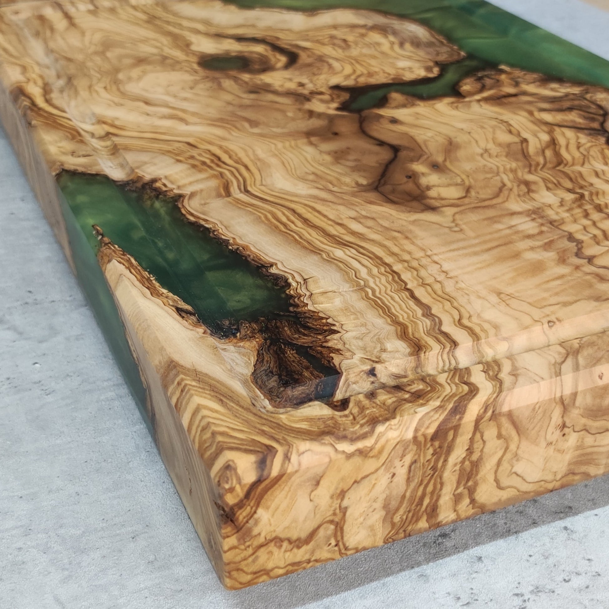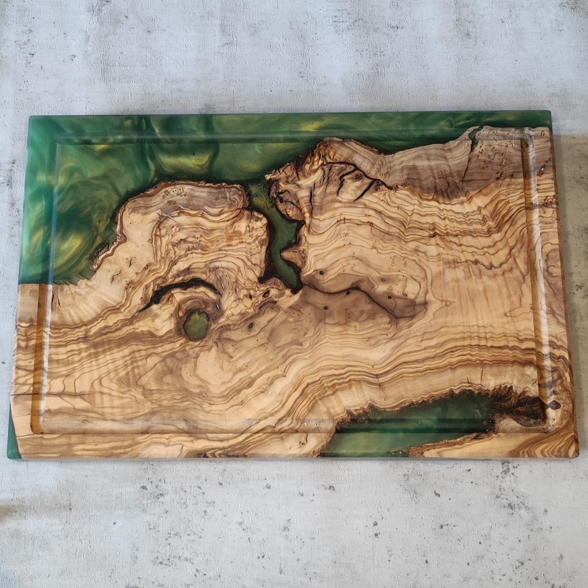 Dieses hochwertige Brett aus edlem Olivenholz und farbigem Epoxidharz vereint elegantes Design mit praktischer Funktionalität. Die integrierte Saftrille fängt Flüssigkeiten zuverlässig auf.