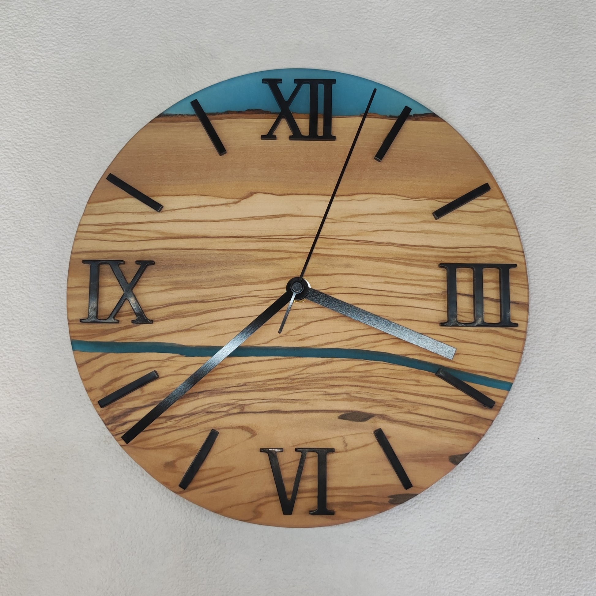 Die Kombination aus den natürlichen Holzstrukturen und dem schönen Schwarz des Harzes sorgt für eine harmonische und zugleich auffällige Optik. Diese wunderschöne Epoxidharz Uhr hat einen Durchmesser von 26 cm und ist ca. 7 mm dick. Die Zahlen sind ebenfalls aus Epoxidharz hergestellt. Eine Aufhängung für die Wand befindet sich an der Rückseite. Es wurde ein Geräuschloses Quarz Uhrwerk verbaut.