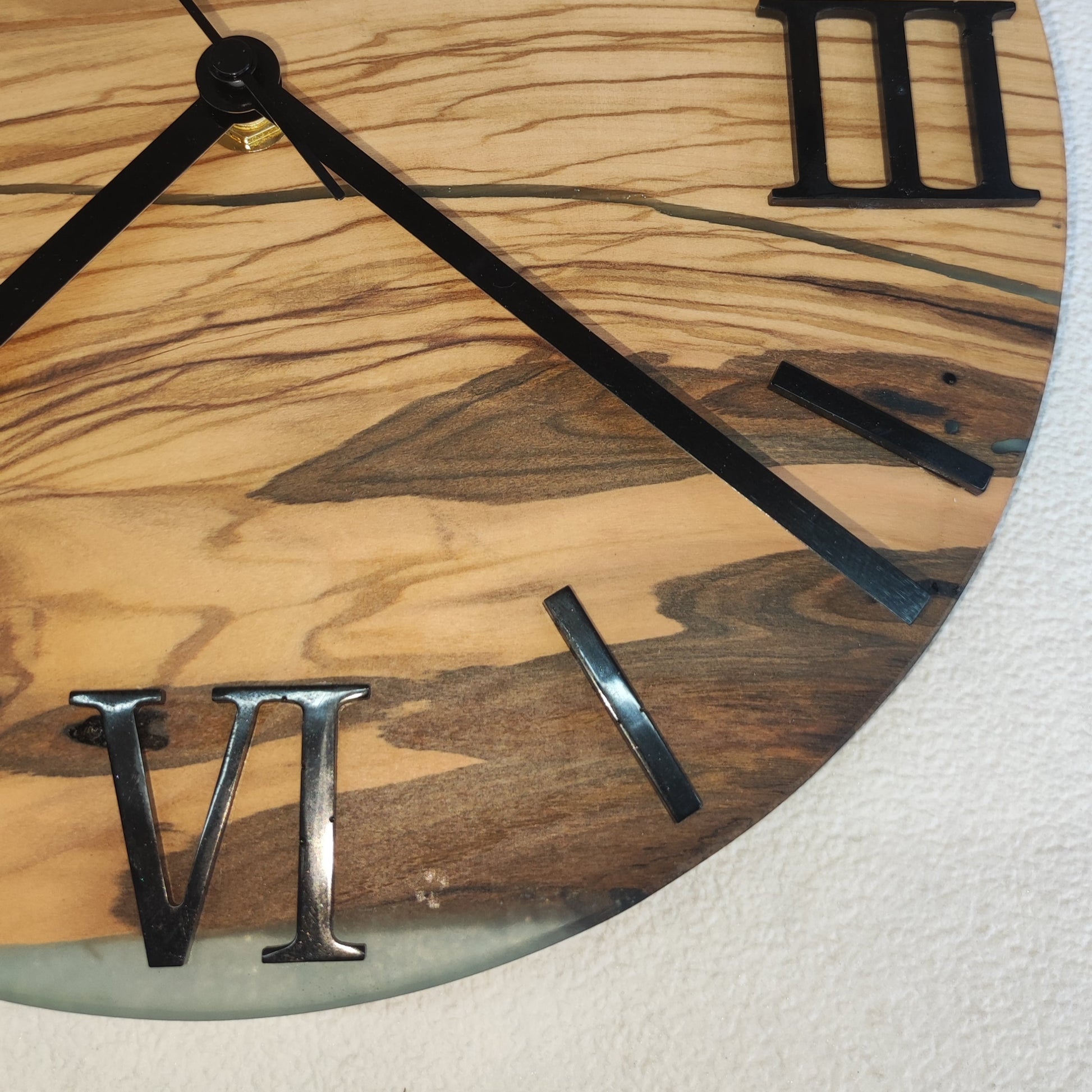 Die Kombination aus den natürlichen Holzstrukturen und dem schönen Schwarz des Harzes sorgt für eine harmonische und zugleich auffällige Optik. Diese wunderschöne Epoxidharz Uhr hat einen Durchmesser von 26 cm und ist ca. 7 mm dick. Die Zahlen sind ebenfalls aus Epoxidharz hergestellt. Eine Aufhängung für die Wand befindet sich an der Rückseite. Es wurde ein Geräuschloses Quarz Uhrwerk verbaut.